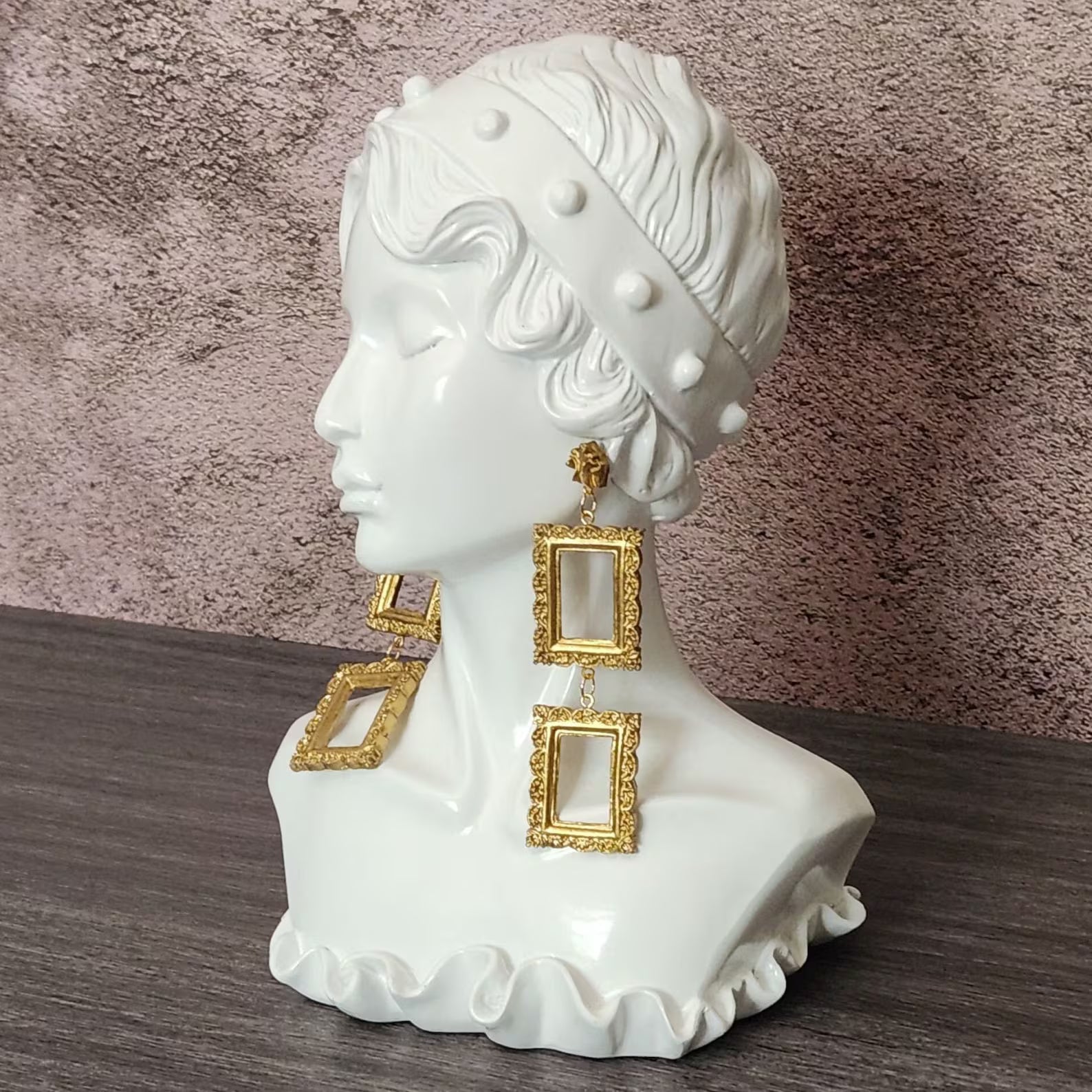 A pair of unique lightweight stacked intricately detailed frame dangles. A statement piece perfect for artists and art enthusiasts.