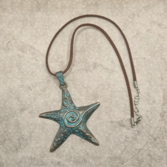 The Starfish pendant is composed of a brass-finished pewter that features a green patina effect, which gives the illusion of the pendant being discovered after lying underwater for centuries.